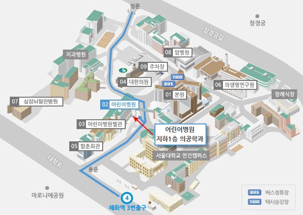 | 어린이병원 B1층 로비에서 의공학과로 오시는 길 |