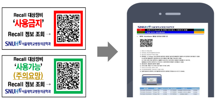 또한 원내에서 사용중인 의료장비에 대한 안전성 정보를 의공학과 자체 전산 시스템에 등록 및 관리하고 있으며 사용자는 장비에 부착된 QR 코드를 통해 이를 확인할 수 있어 의료장비를 보다 안전하게 사용할 수 있다.